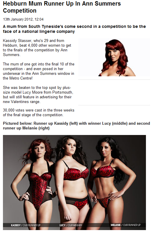 Kassidy Stasser Posted By admin on 13/01/2012 Hebburn mother Kassidy Stasser was entered into a national competition ran by Ann Summers to find a new face of the company, click the image below to read how she came 2nd overall